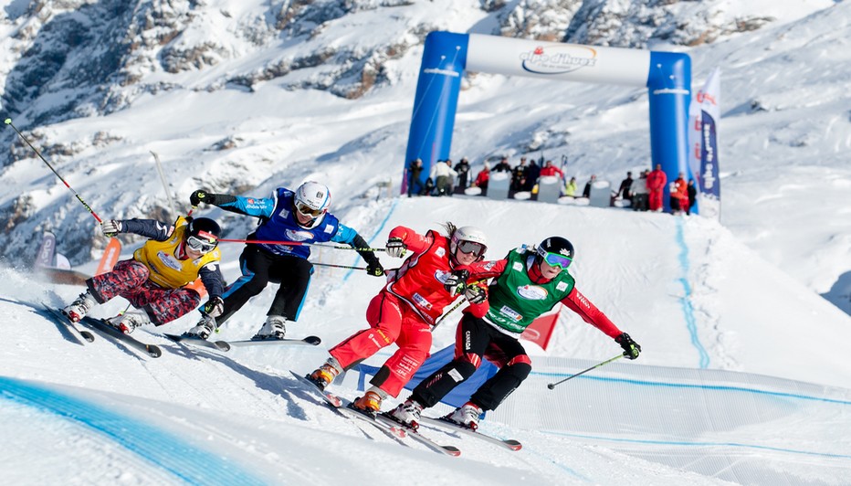 En haut vue panoramique de la station de ski de l'Alpe d'Huez © L.Salino; Son point fort est incontestablement le panorama du Pic Blanc qui culmine à 3330 mètres d’altitude, accessible grâce au téléphérique des Grandes Rousses © L.Salino; Ophélie David, championne de ski-cross en pleine descente © L.Salino