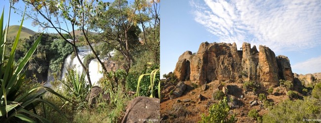 De gauche à droite : chute de la Lily et l’Isalo avec ses massifs de grès sculptés par l’érosion. © Yann Menguy