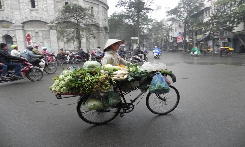 Il est courant de rencontrer en pleine ville d'Hanoï ces vélos chargés de légumes cultivés dans les campagnes avoisinantes (Crédit photo www.monique-abellard.fr)